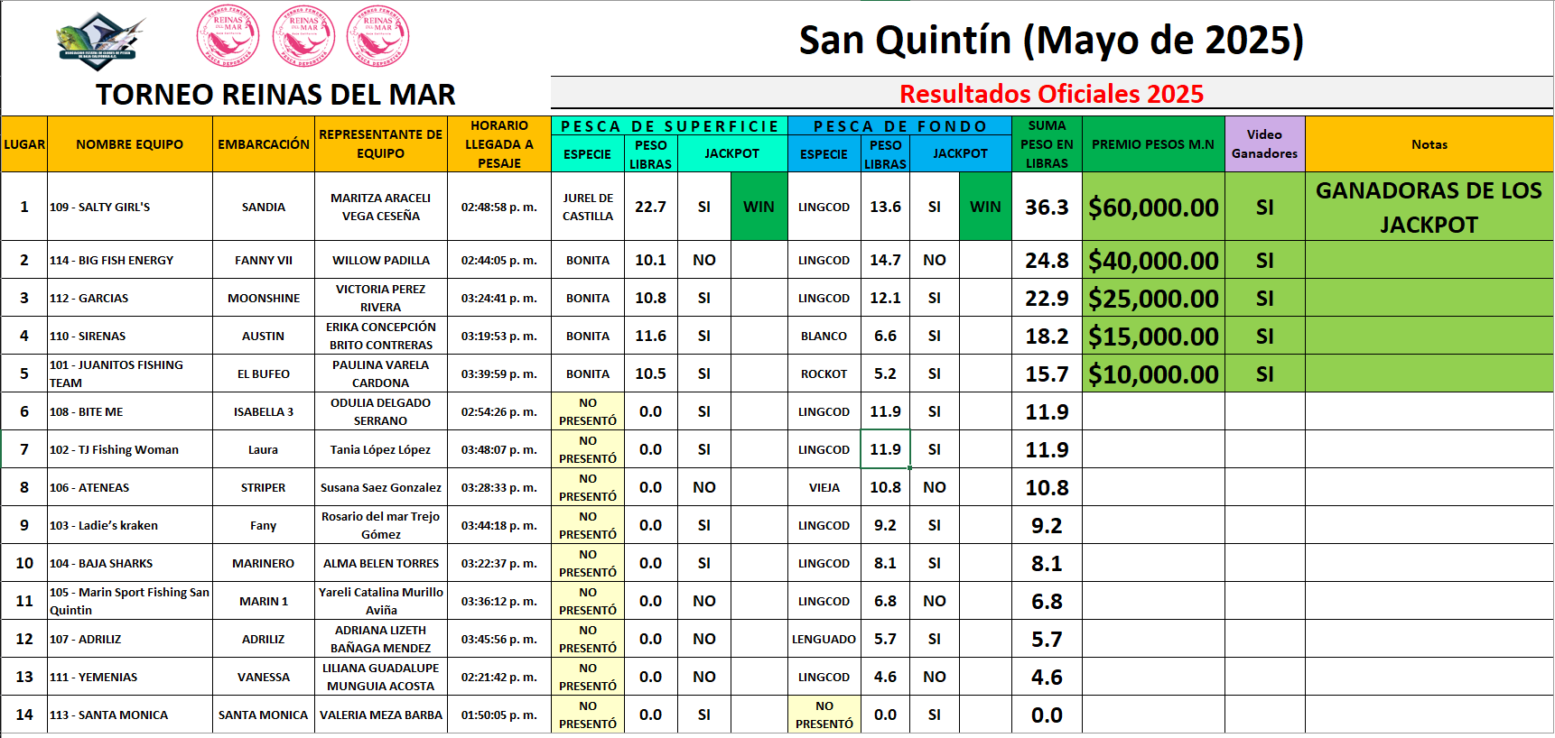 RESULTADOS OFICIALES / RESULTS REGLAMENTOS / REGULATIONS BASES GENERALES / GENERAL RULES CATÁLOGO DE ESPECIES DEL TORNEO / SPECIES CATALOG FOR THE TOURNAMENT NORMATIVAS / REGULATIONS INFORMACIÓN / INFORMATION PREMIOS / PRIZES PROGRAMA OFICIAL / OFFICIAL PROGRAM PERMISOS / PERMITS RESULTADOS OFICIALES TORNEO REINAS DEL MAR 2025 CONTACTO Correo Electrónicotorneoreinasdelmar@gmail.com Teléfonos deLunes a Viernes 8:00 a 16:00 hrs Ensenada: (646) 172-3080 Ext. 3264 y 3318