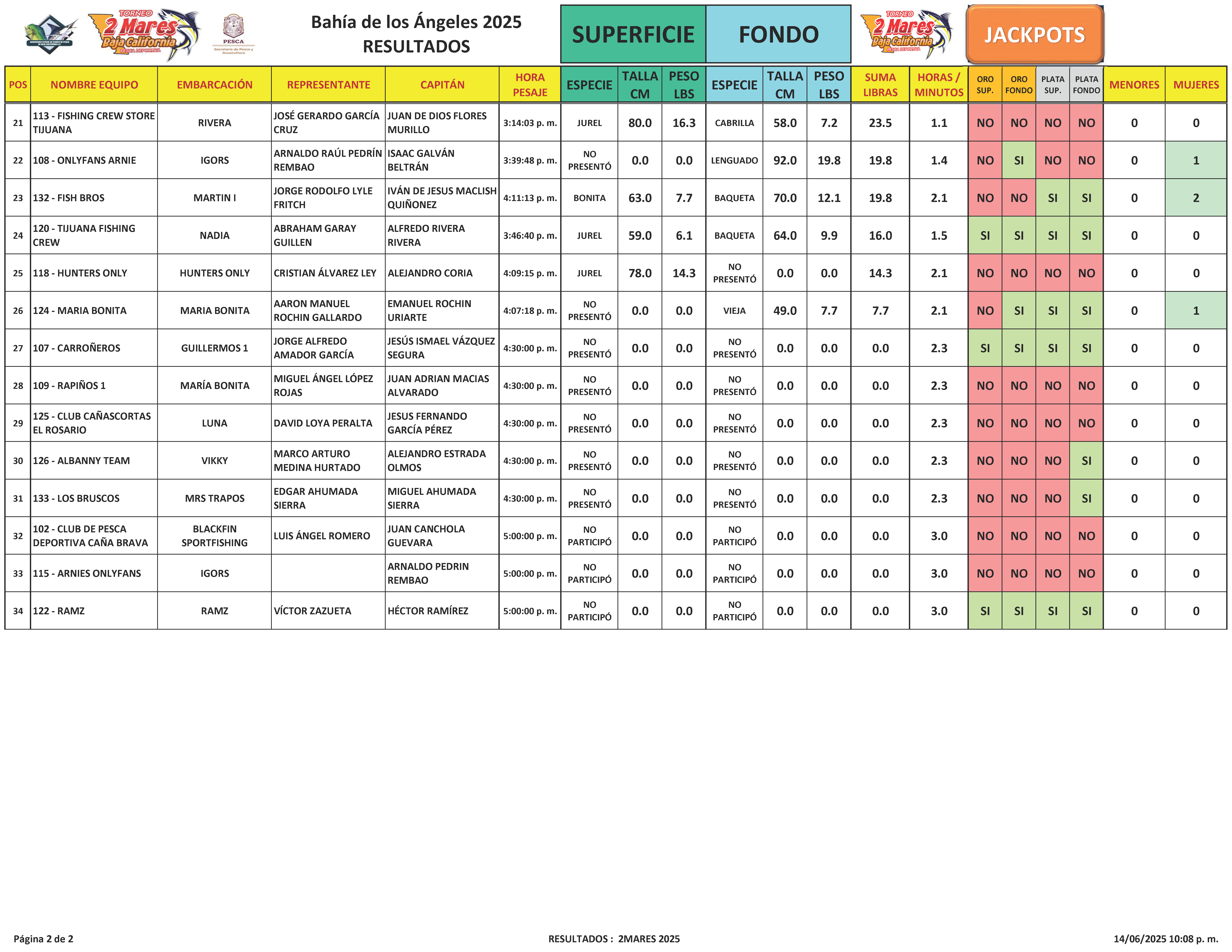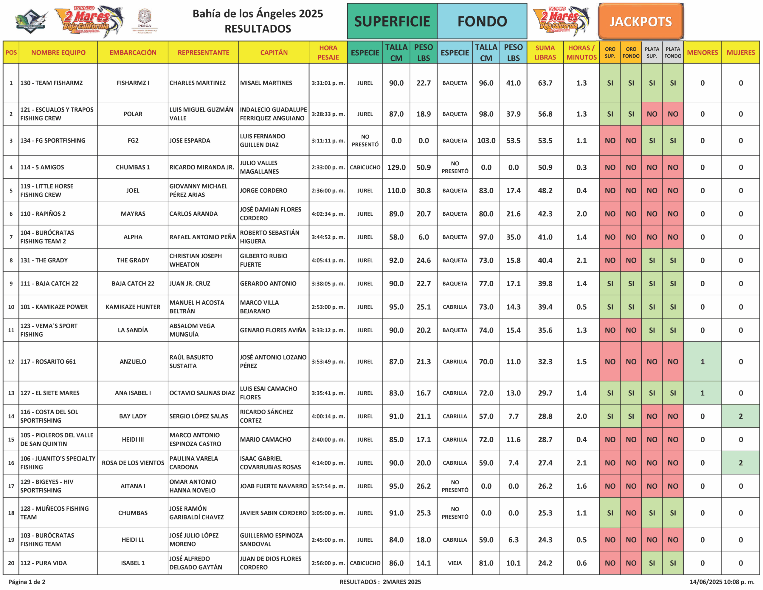 SEDES / VENUES Bahia de los Angeles, Baja California Ensenada, Baja California REGLAMENTOS / REGULATIONS Bases Generales / General Rules Catálogo de especies del torneo / Species catalog for the tournament Normativas / Regulations PERMISOS / PERMITS RESULTADOS BAHIA DE LOS ANGELES CONTACTO Correo Electrónicodosmaresbaja@gmail.com Teléfonos deLunes a Viernes 8:00 a 16:00 hrs Ensenada: (646) 172-3080 Ext. 3264 y 3318