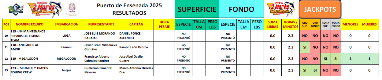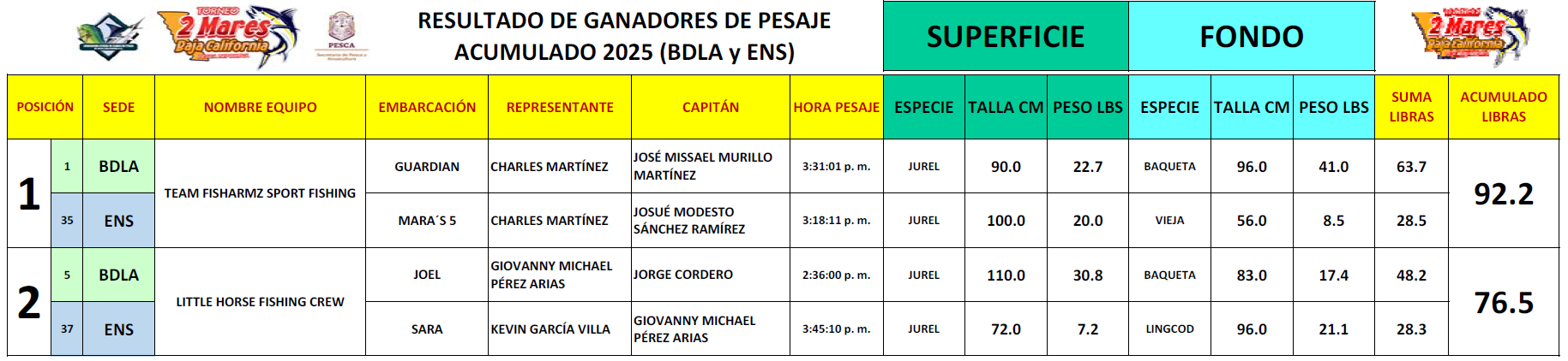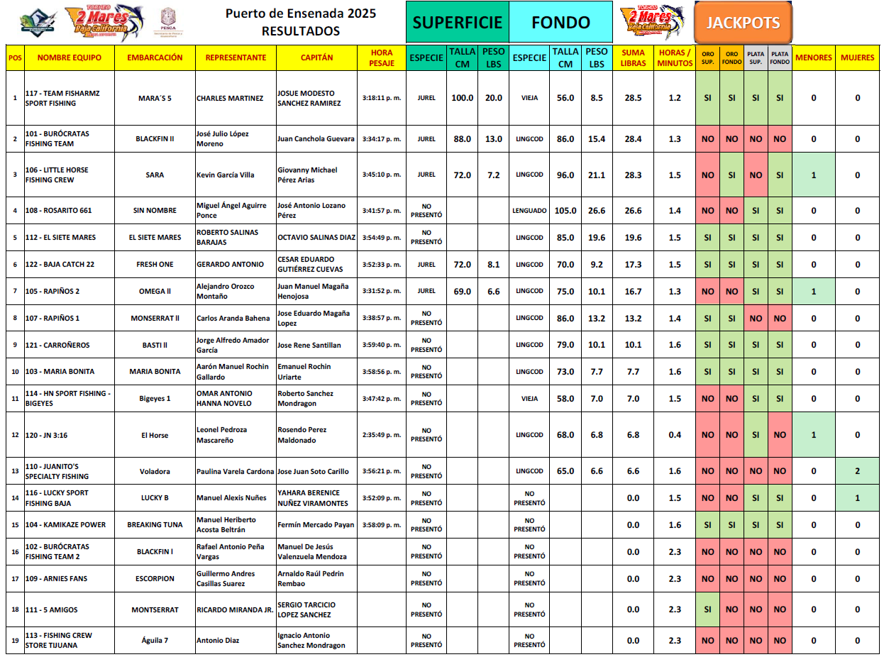 SEDES / VENUES Bahia de los Angeles, Baja California Ensenada, Baja California REGLAMENTOS / REGULATIONS Bases Generales / General Rules Catálogo de especies del torneo / Species catalog for the tournament Normativas / Regulations PERMISOS / PERMITS RESULTADOS ENSENADA GANADORES DE PREMIOS POR PESAJE ACULUDADO DE LAS SEDES EN BAHÍA DE LOS ÁNGELES Y ENSENADA CONTACTO Correo Electrónicodosmaresbaja@gmail.com Teléfonos deLunes a Viernes 8:00 a 16:00 hrs Ensenada: (646) 172-3080 Ext. 3264 y 3318
